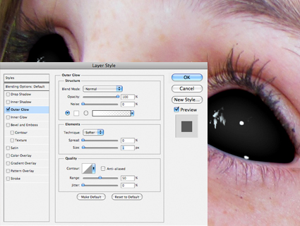 Double click on the eye shine layer, and choose Outer Glow in the Layer Styles dialog box. Set the Blend Mode to Normal, and the Opacity to 100%. The colour should be White, and the Size set to 1 px.