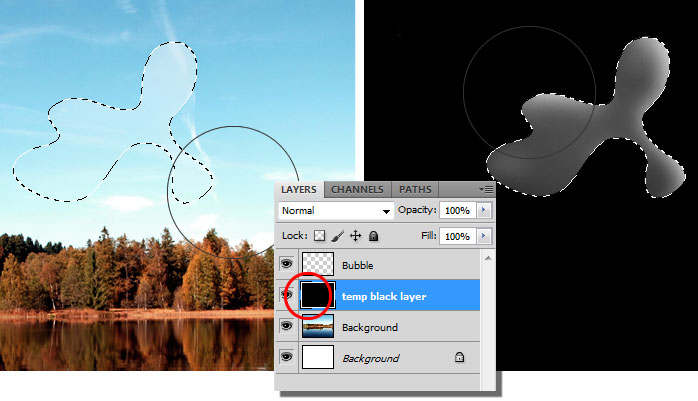 Brush very gentle around the borders of the selection (image 1). If you want to have more contrast while brushing, you can create a new layer (optional) which we call “temp black layer” (image 2). Look where the light is coming from and create highlights with your brush. You should get something like the image below (image 2).