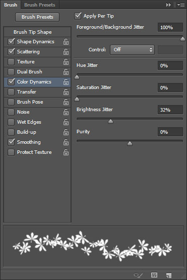 Open the Brush panel (Window -> Brush), and pick the "Sampled Brush #33? brush again, then modify its settings as shown below.