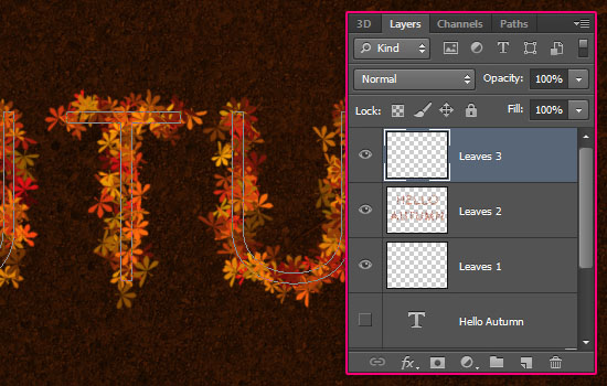 - Select the "Leaves 3? layer so that its is the active layer, then stroke the path once again. This will add another layer of leaves. Two separate layers are used so that we can add a Layer Style for each one of them later on.